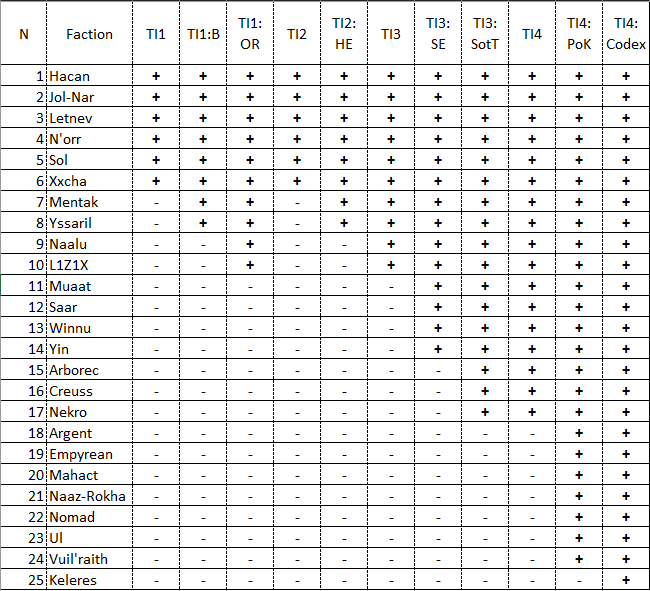 NOTE: Описание фракций в TI3 и TI4 практически идентично, за исключением Арборека и одного абзаца Nekro. Небольшие добавления в виде catch phrase на лицевой стороне листа фракции в TI4 и краткого описания в правом верхнем углу оборотной стороны выделены отдельно.
